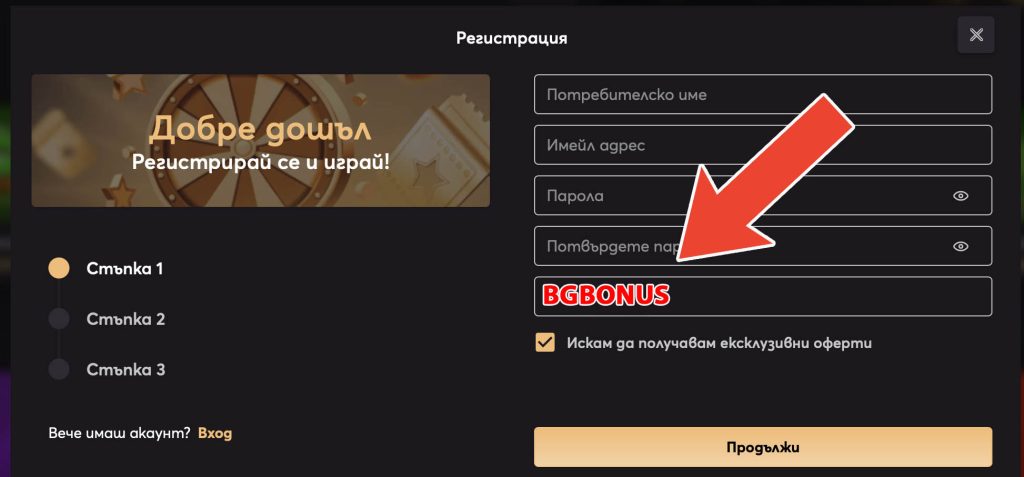 🚨ВАЖНО: Промо кодът при регистрация в Betvam e BGBONUS и се въвежда в Промо код полето, което излиза само по време на регистрация.